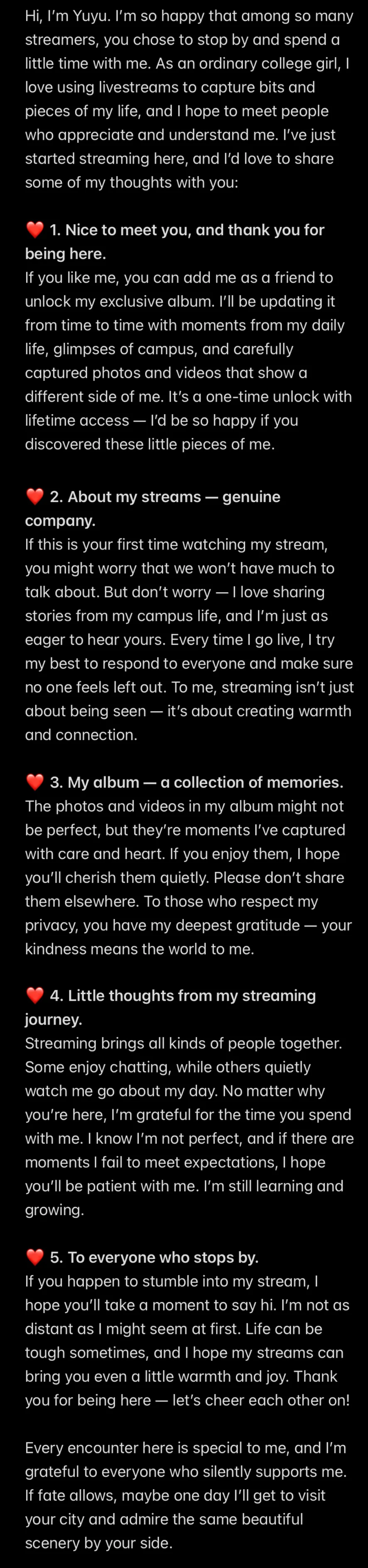 有时候直播会遇到不一样的观众,有的喜欢聊天,有的喜欢安静看我忙碌的样子,但无论怎样,我都很感激你愿意花时间陪我。如果有时候我没能照顾到你的感受,希望你能包容我一下,我还在慢慢成长。